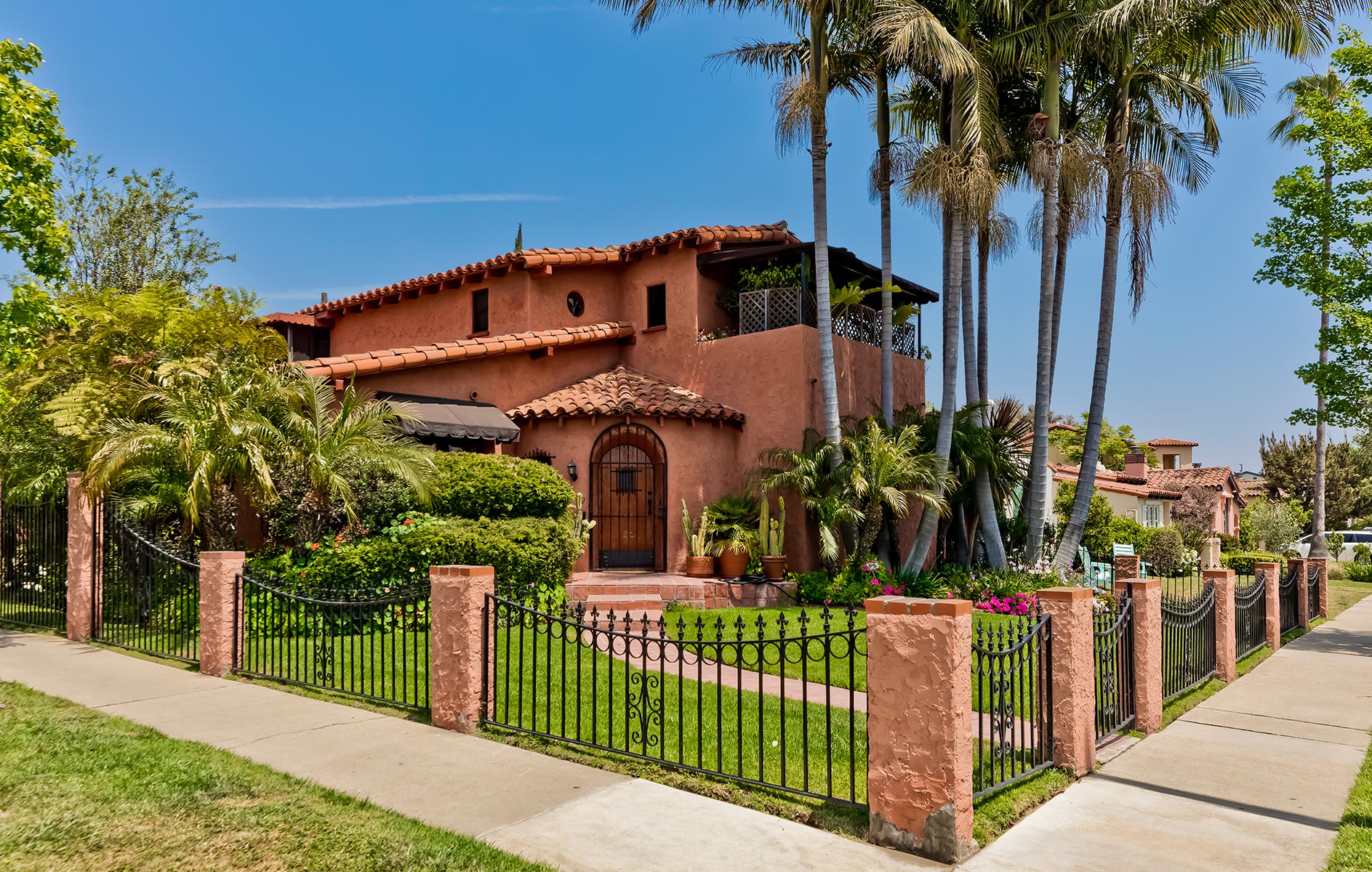 2-story 4 Bdrm Spanish-style architectural on an excellent Beverlywood corner lot. This home is rich in architectural details and design elements throughout. From the Saltillo tiled entry w/tiled accent tiles, guest closet and window seat to a large living room with fireplace, bay window, stained glass windows, coved ceilings with wood beams, and custom wood built-ins. Peg and groove style hardwood flooring throughout the lower floor. Light and bright South facing formal dining room has wood moldings. The dine-in kitchen boasts newer stainless-steel double oven and appliances, rich blue tiled countertops, Saltillo tile flooring and a large pantry. 2 bedrooms on the 1st floor, both with sizable closet space. The 2nd floor Master bedroom and a full bath has a dressing area, a relaxing sun-room and a large balcony. The bath features lustrous emerald and white tiles, spa tub and a sizable shower. The 2nd upstairs bedroom shares the full bath. There is a cavernous Saltillo tiled upstairs sunroom that receives wonderful and relaxing afternoon breezes. The private rear courtyard patio is predominantly brick with a whimsical fountain and has access to a private solarium and enclosed yard. Other features include HVAC, California basement, and detached 2-car garage.
